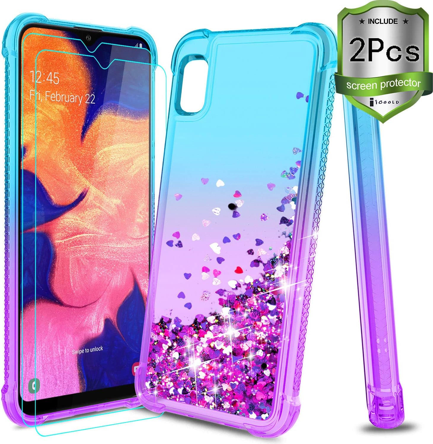 iCoold Samsung Galaxy A10e case,w/Screen Protector[2 Pack],Four-Corner Glitter Bling Floating Quicksand Silicone Slim Non-slip Shockproof Bumper Protective TPU Cover for Girls Women,Teal/Purple